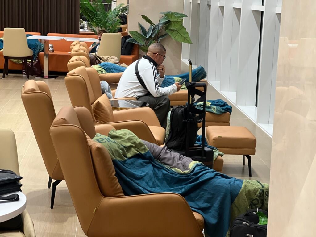 Dans un coin de l salle , des jeunes ont préféré tromper l’attente en gardant leurs jeux de cartes ouverts, transformant l’espace en lieu d’animation improvisé jusqu’à l’aube sans fermer l’œil. Ailleurs, des familles s’organisent tant bien que mal. « Peu importe les conditions, il faut juste réussir à dormir un peu », confie Alice, allongée sur une rangée de sièges métalliques.